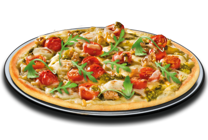 (PizzateigA, A1, frische Pestocreme10, C, G, H4, Walnüsse H3, MozzarellaG, Gouda-KäseG)